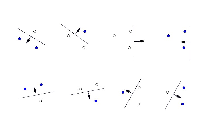 For example, suppose we have a set of data points with Oriented Hyperplanes in R^2, and the set {f(α)} consists of oriented straight lines, so that for a given line, all points on one side are assigned the class 1, and all points on the other side, the class −1.The orientation is shown in Figure below by an arrow, the side of the line points are to be assigned the label 1.