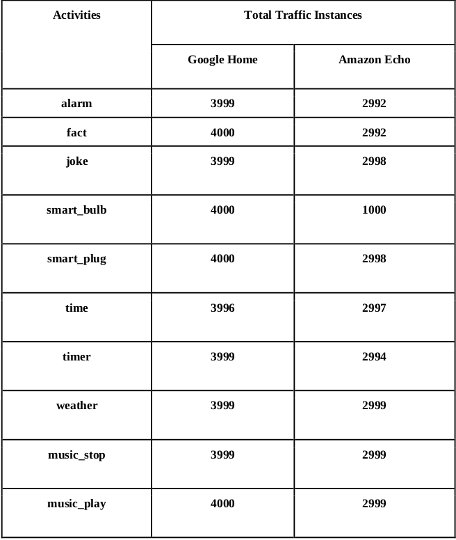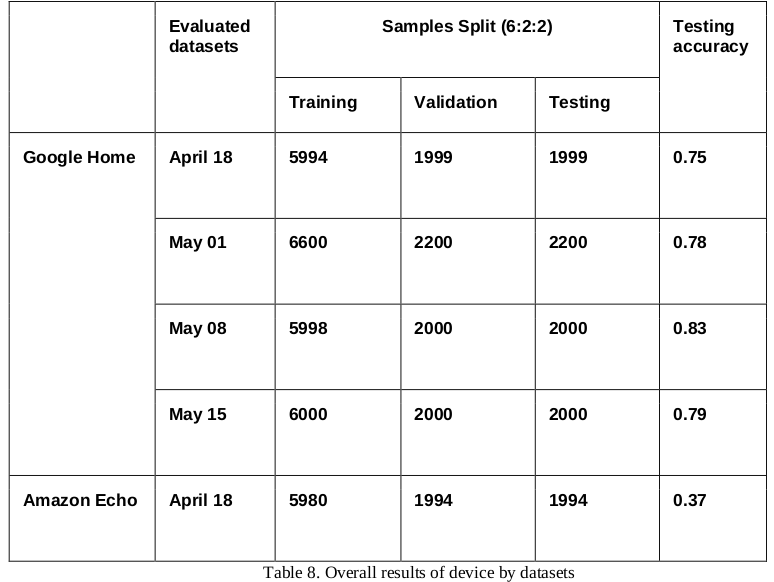 Incomplete data due to technical issues. Due to technical issues and device usage conflicts, the amount of data for Amazon Echo is incomplete and much less than Google home. And somehow this influences the later performance of classification.