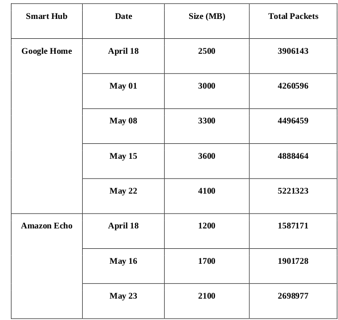 With the characteristics of the network traces used in the experiments analysed above, we need to then select packet sizes from each instance as the input vector and normalize it. This is decided by applying statistics on the data from Google Home and Amazon Echo separately, the results are presented in the table below. Here, the most important statistical results are considered as mean value and standard deviation value, as we need to make the input global size less than the sum of mean value and standard deviation value considering the data balance. Due to the space limit, we only take the data of the first week (April 18) as the sample dataset to apply such statistics. As shown in the last row of table, the chosen input size of Amazon Echo dataset is 300 while Google Home dataset is 600.
