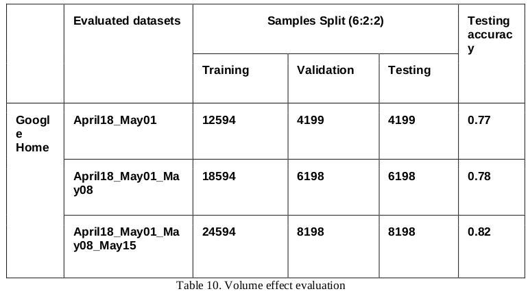 The volume of data is also considered to be an important influence factor for performance. To examine this, we implement the classifier obtained from different volumes of datasets to evaluate the performance. Due to technical issues, the data of Amazon Echo dataset is incomplete for all 10 activities, so it is excluded here. As shown in the table below, we increase the volume of data by merging several datasets together, for example, dataset April18_May01 means the combination of dataset April18 and dataset May01. The dataset split for testing is same as described before, it is indicated that the performance is slightly improved with the increasing volume of data.